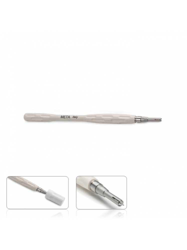 O METAPIN HOLDER é um instrumento de colocação de tachas autoclavável com uma tampa de proteção que tem de ser removida durante a fase da colocação do METPIN, e pode ser utilizada, quando necessário, para bater na cabeça da tacha já posicionada, para completar o processo de estabilização.