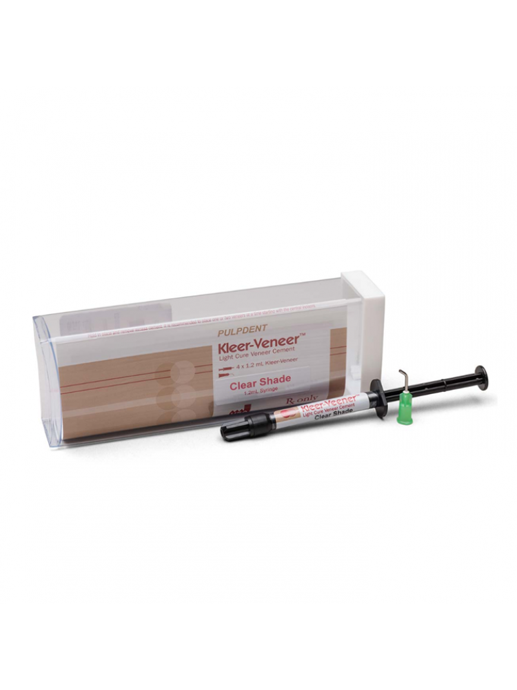 O Kleer-Veneer™ é um cimento de facetas único, tolerante à humidade e auto-adesivo. Sem a necessidade de agentes adesivos no esmalte nem silano na cerâmica. É indicado agente adesivo e ataque ácido na dentina. A consistência única do Kleer-Veneer™ segura a faceta no local sem deslizar ou qualquer outro movimento.