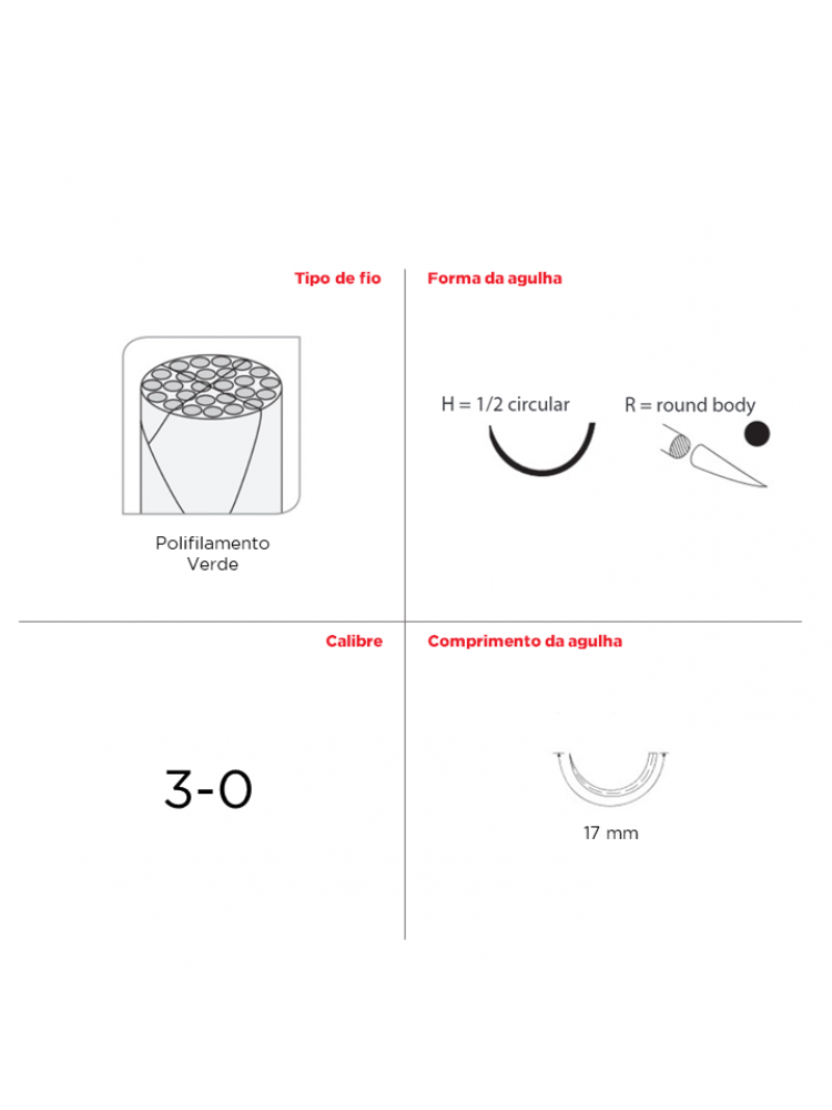 | Forma da agulha | 1/2 Circular, corpo redondo |