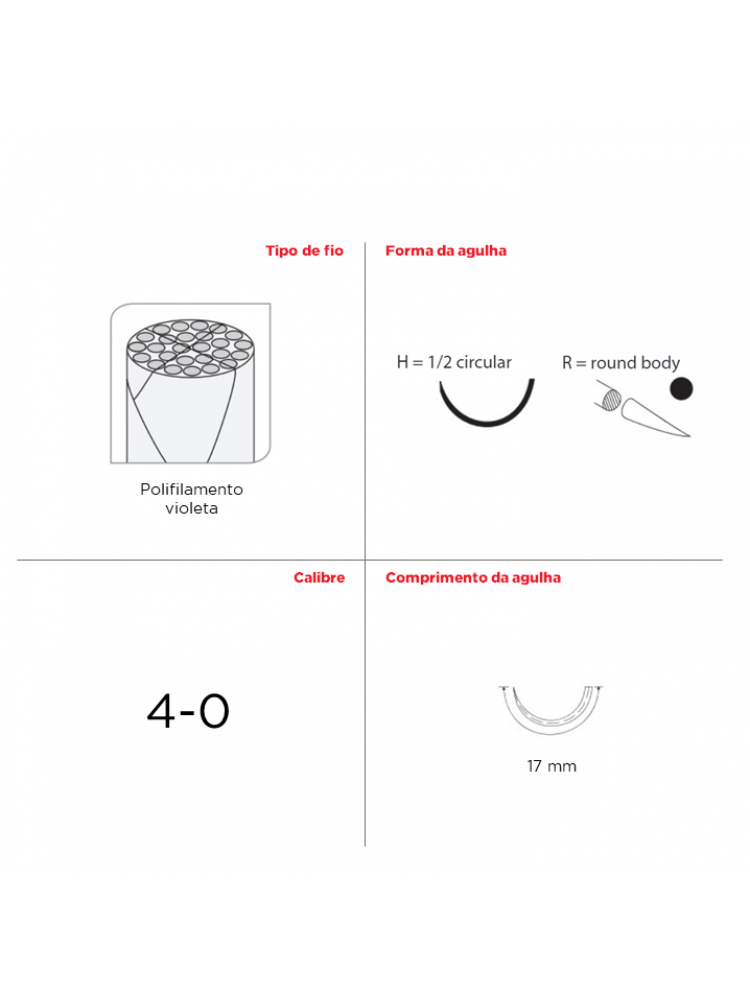 | Forma da agulha | 1/2 Circular, corpo redondo |