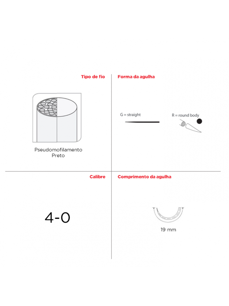 - Pseudomonofilamento até ao calíbre 4-0 e monofilamento em calíbre 5-0;