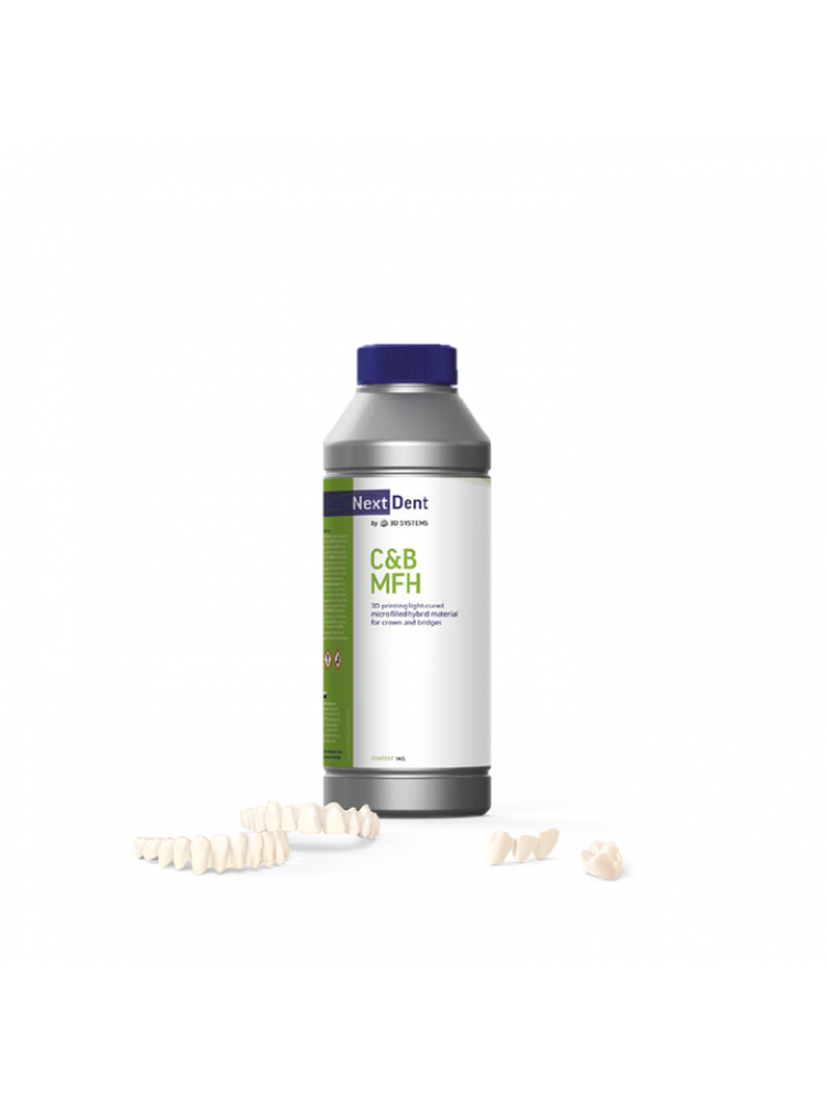 A NextDent C&B Micro Filled Hybrid (MFH) é uma resina (material biocompatível classe IIa) desenvolvida para a Impressão 3De coroas e pontes. O balanço entre os excipientes inorgânicos a resina conferem ao material a sua resistência e grande durabilidade.